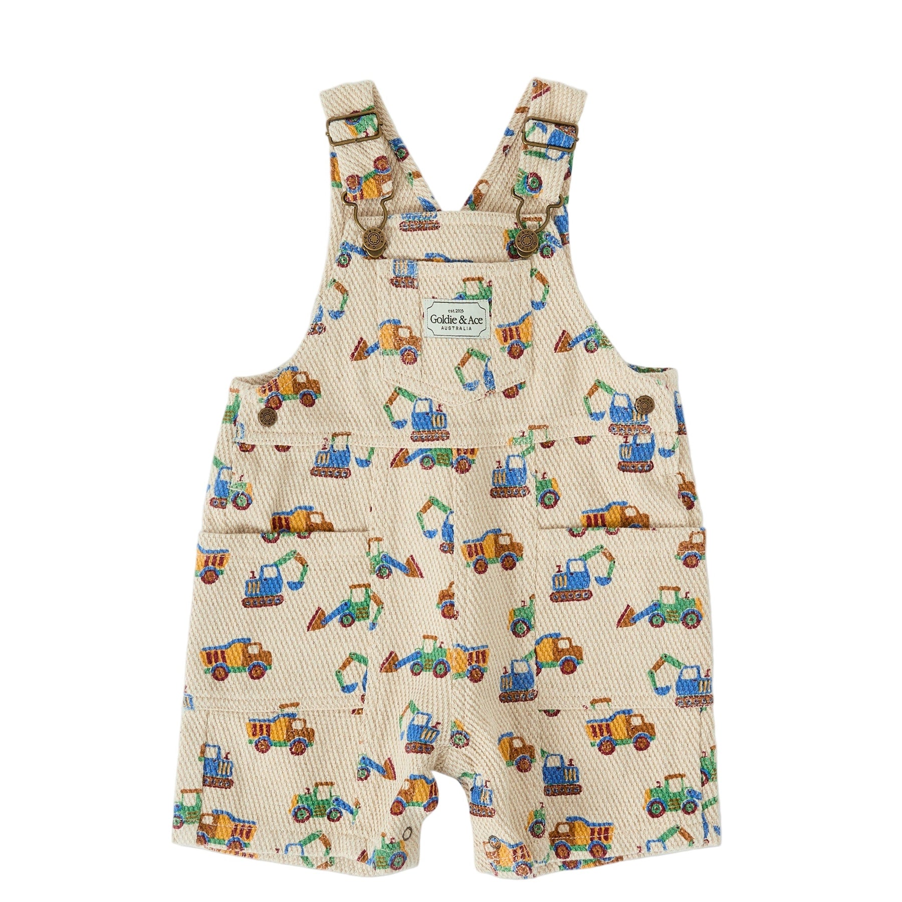 True to size. Relaxed fit. The addition of functional wrap around pockets adds a fun twist to a classic shape. Adjustable straps with brass clasps for room to grow and leg snaps up to a size 2 for easy dressing. Hand drawn digger print.