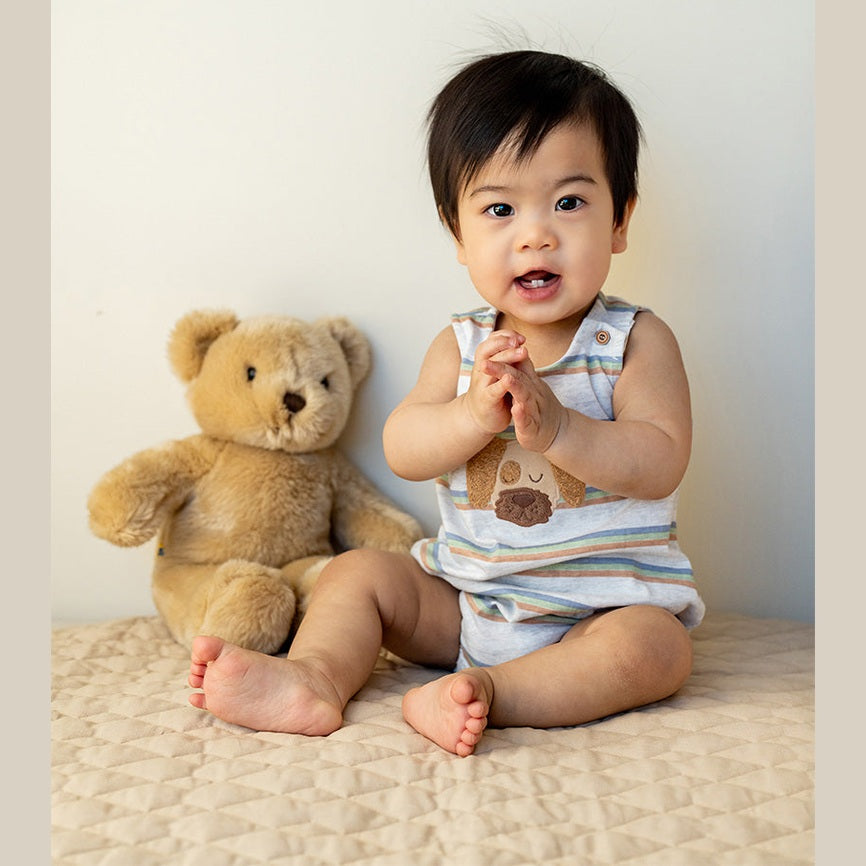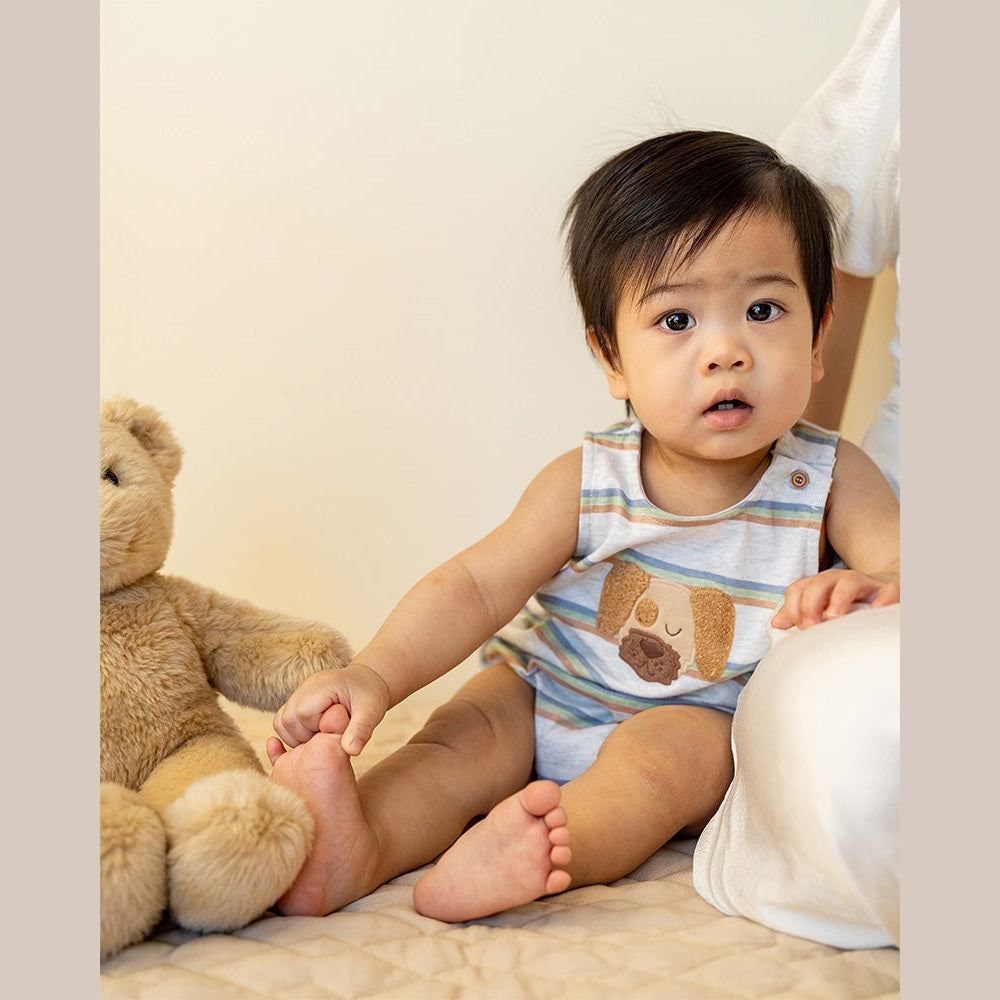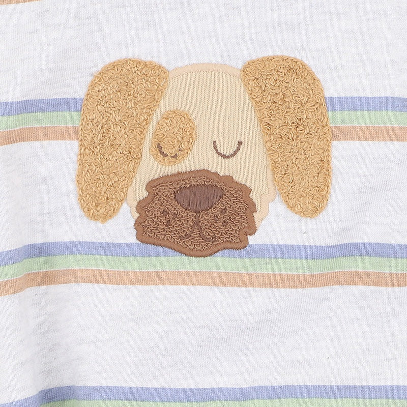 A playful pup for sunny day adventures. This striped romper is soft, sweet and full of fun, with an adorable tufted dog embroidery and soft pastel hues. Perfect for playtime or outings with mum and dad, it's designed for comfort and ease with simple fastenings and a relaxed fit.