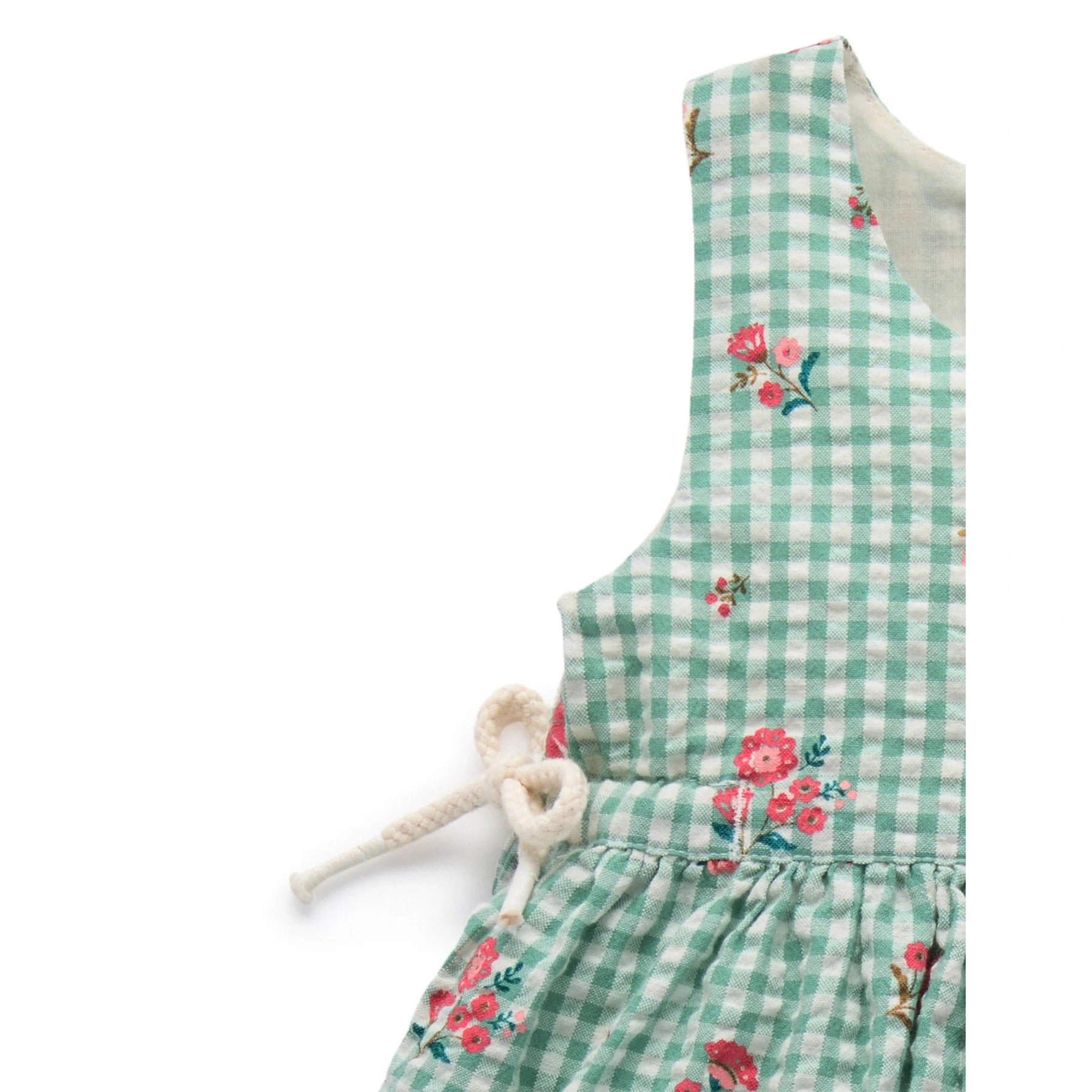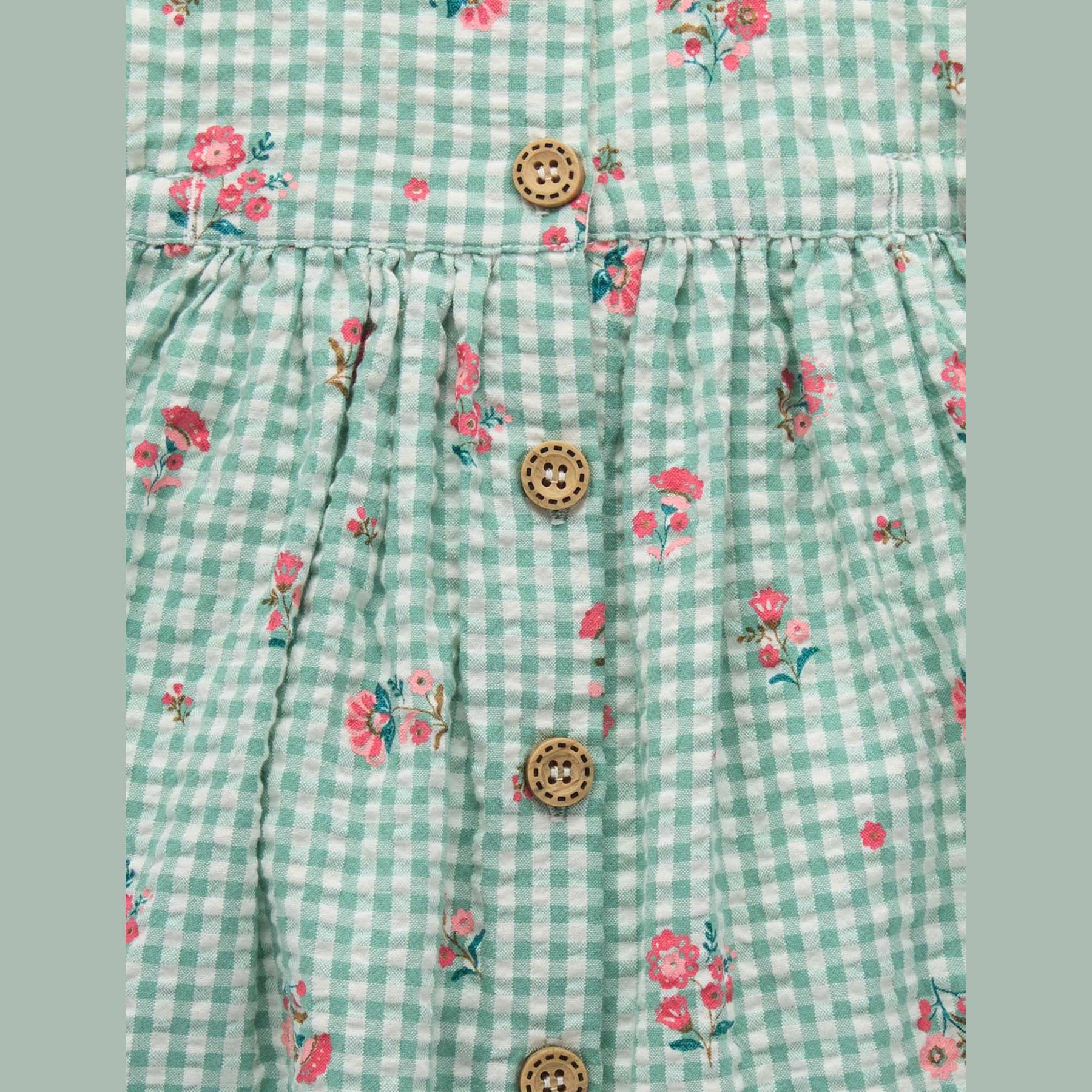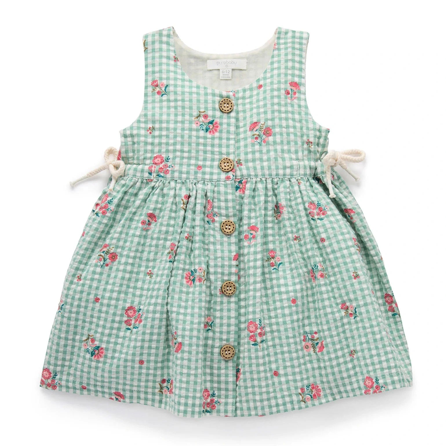 Frida Gingham Pinnie is a pretty layering piece. Featuring a sweet all over gingham and floral print with a gathered skirt, adjustable side ties and front buttons for easy dressing. Made from soft 100% Organic Cotton seersucker for a soft and breathable style. This pinnie can be layered, or worn on its own when the weather warms up!