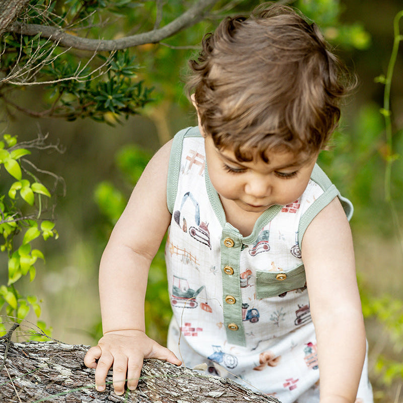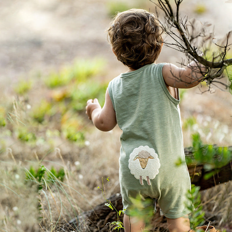 This sweet little playsuit is a nostalgic nod to country days and wide-open paddocks. Made from soft, breathable 100% cotton, it features a warm check pattern and an adorable bouclé embroidered sheep at the chest for a playful farmyard touch. Wooden-look buttons at the shoulders and sides add charm while making dressing easy, and press studs at the crotch ensure quick nappy changes.