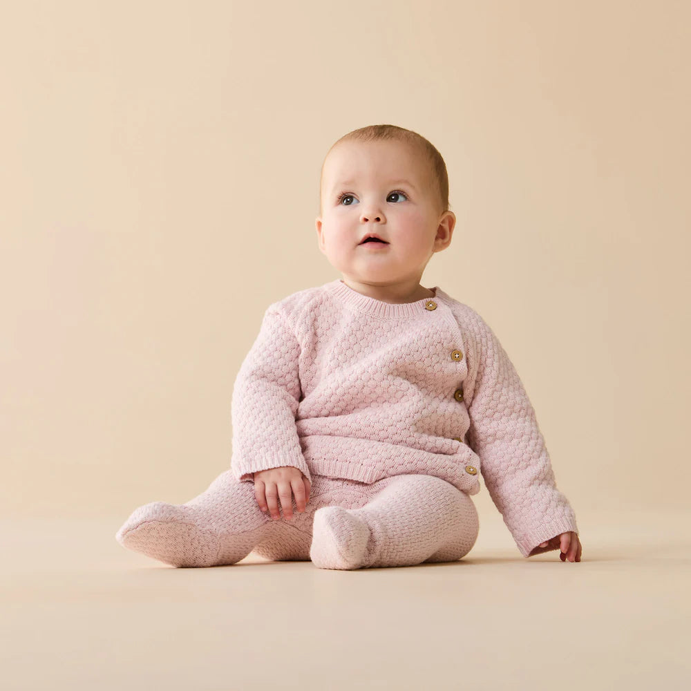 Stay cosy and stylish with our knitted baby leggings featuring a sweet bauble design. Made from a soft and breathable blend of organic cotton, bamboo, and wool, these leggings are perfect for keeping little legs warm and comfy all day long. The gentle elastic waistband ensures a snug fit without digging into delicate tummies. A must-have for everyday wear during the cooler months.
