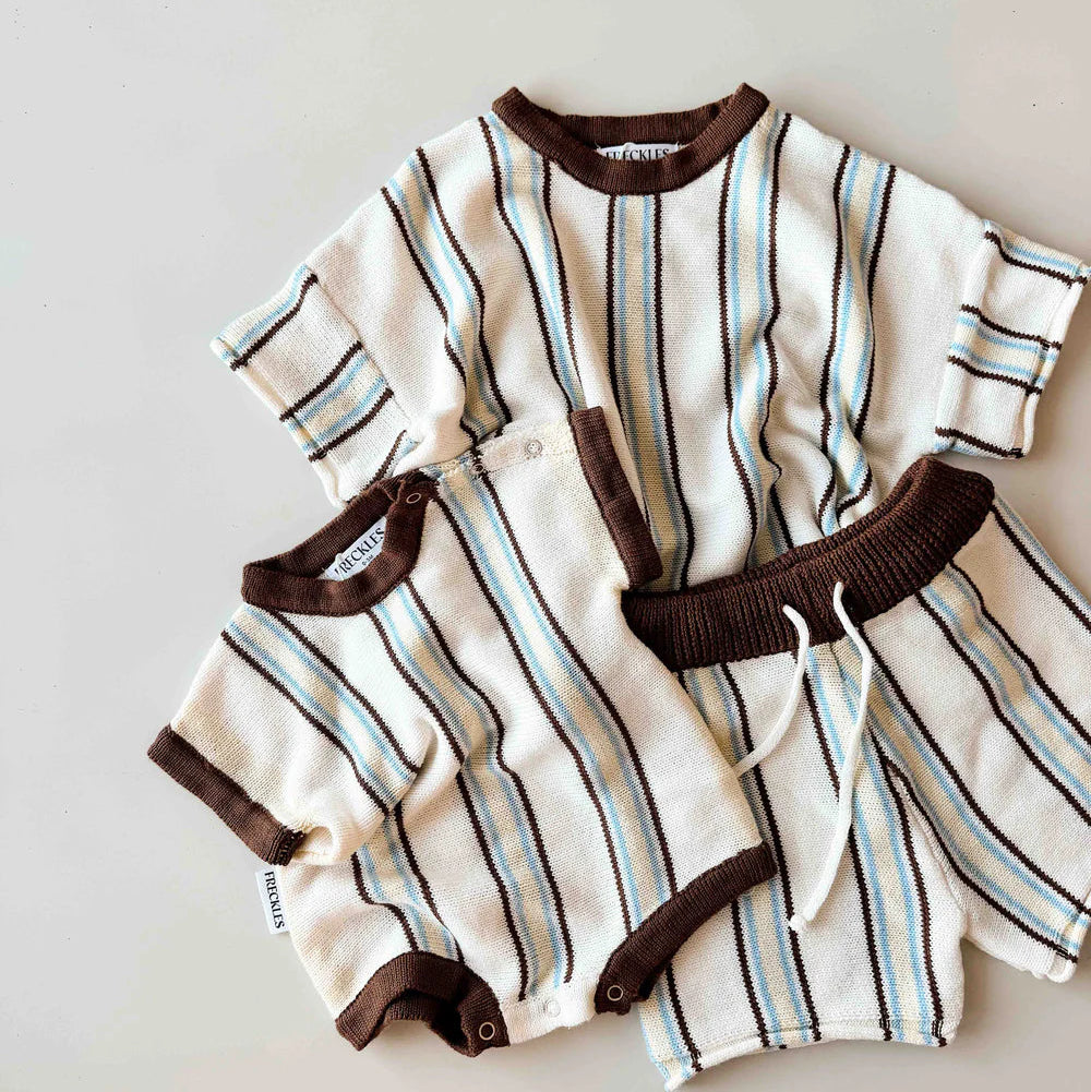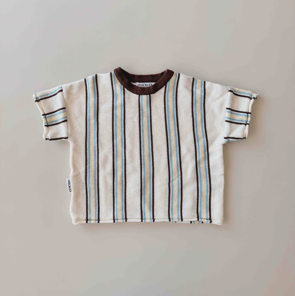 The Retro Stripe Cotton Tee is knitted from natural, soft cotton, gentle on your little one's delicate skin. It combines soft cream with chocolate, ice blue and buttery yellow. Versatile and comfortable, it’s simple enough for everyday wear while adding a charming retro touch to your little one’s wardrobe.