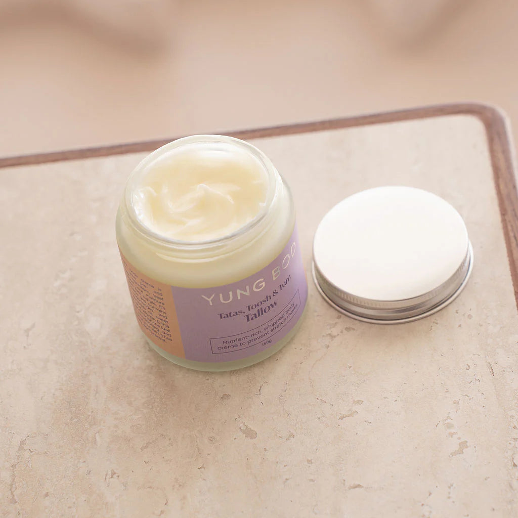 The YUNG BOD Tatas, Toosh & Tum Tallow Creme ™ 150g is a nutrient-rich yet lightweight whipped body cream. It’s formulated to nurture your skin, particularly if it’s lacking its usual perkiness.