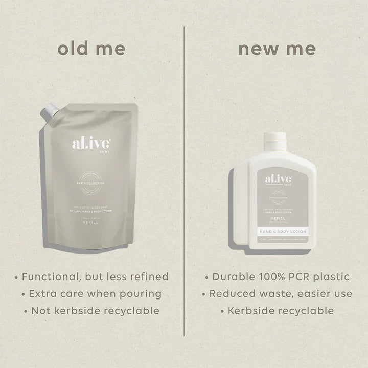 Refill your Sea Cotton & Coconut Lotion bottle with our 650 ml Lotion Refill. This sustainable refill solution is designed to reduce waste and offer a practical, eco-friendly way to top up your favourite al.ive body essential.