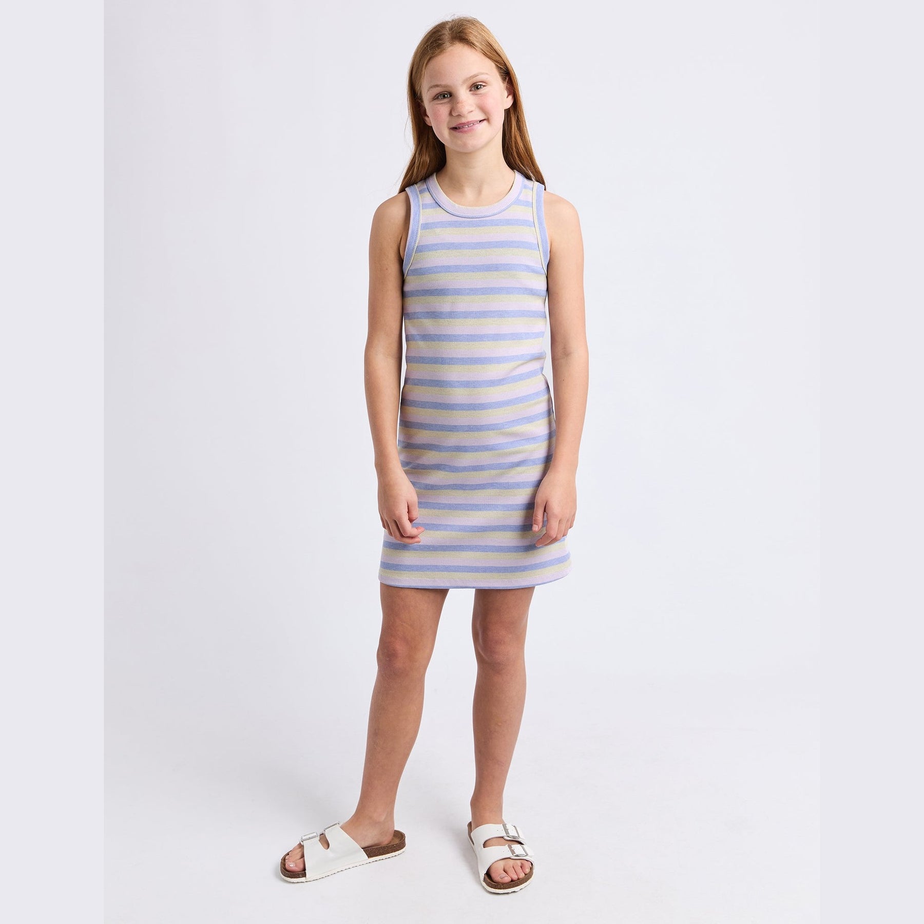 The Callie Rib Tank Dress by Eve Girl is the perfect summer dress. This tank dress is made from a soft, stretchy rib fabrication and features an all-over stripe design, with a sparkle fleck through the stripe. Complete with twin needle stitching, self fabric bind and straight hem.