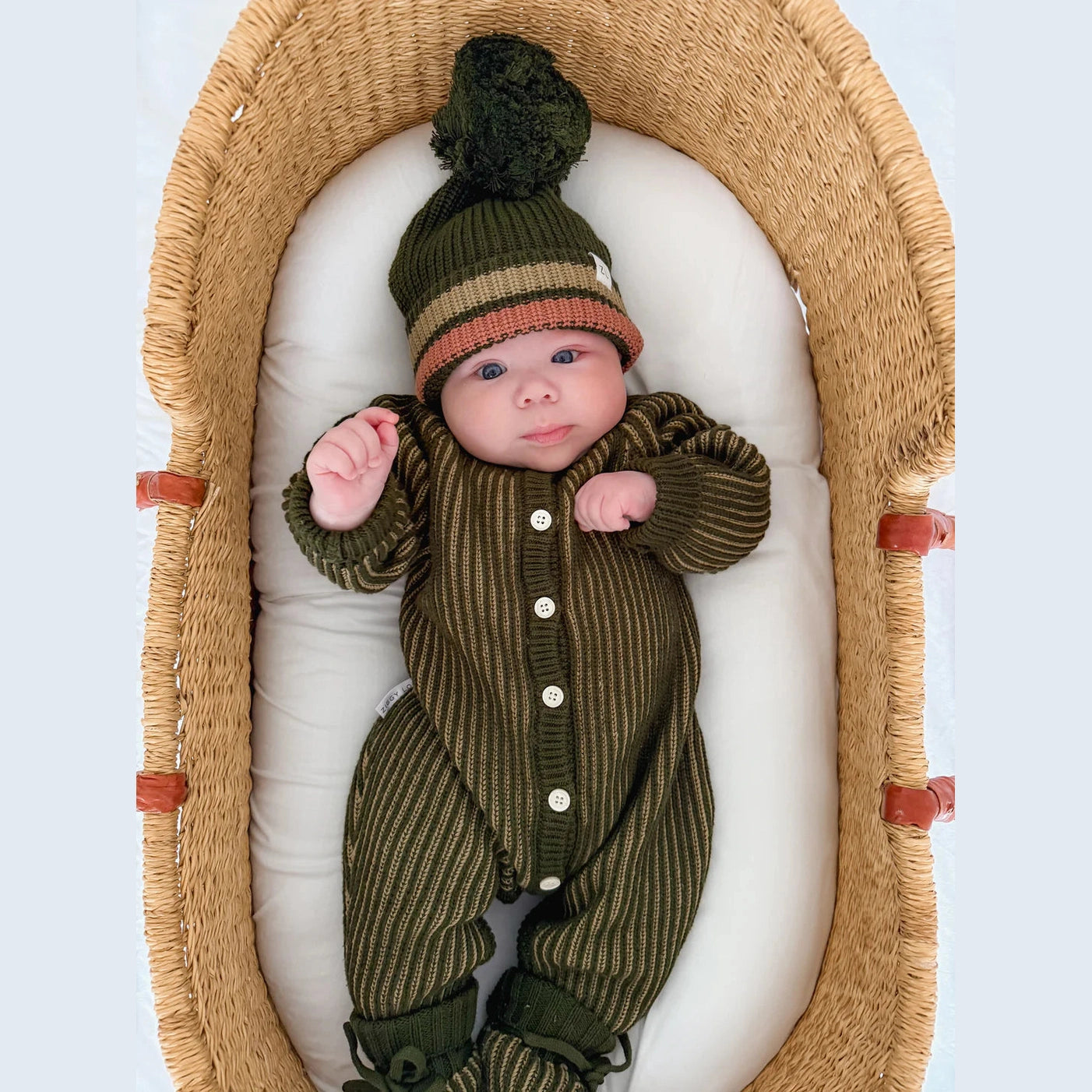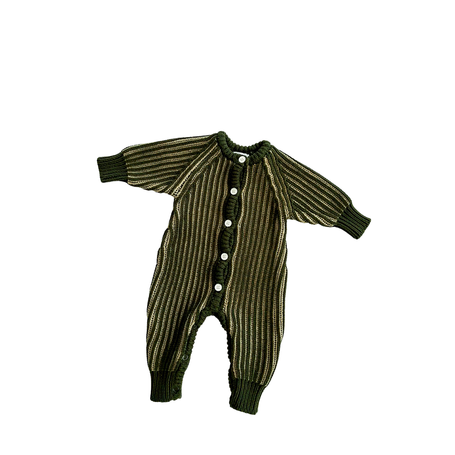 Braided two tone knit Pesto romper featuring functional buttons down the front and press snaps at crotch and legs for easy nappy change and on/off.