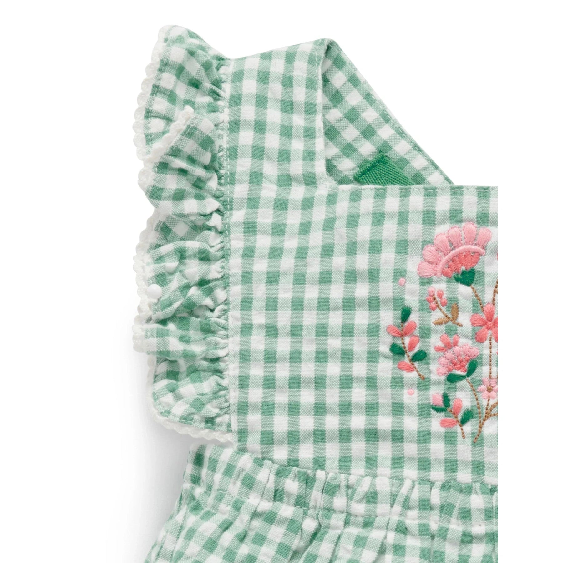 Frida Gingham Romper is the perfect style for keeping your little one cool and cute on those warm summer days! Featuring a pretty, all over gingham pattern, with ruffle lace details at shoulders, floral embroidery and adjustable straps. Made from soft, lightweight 100% Organic Cotton Seersucker. Wear on its own, or layer over our Pointelle Tee for cooler weather.