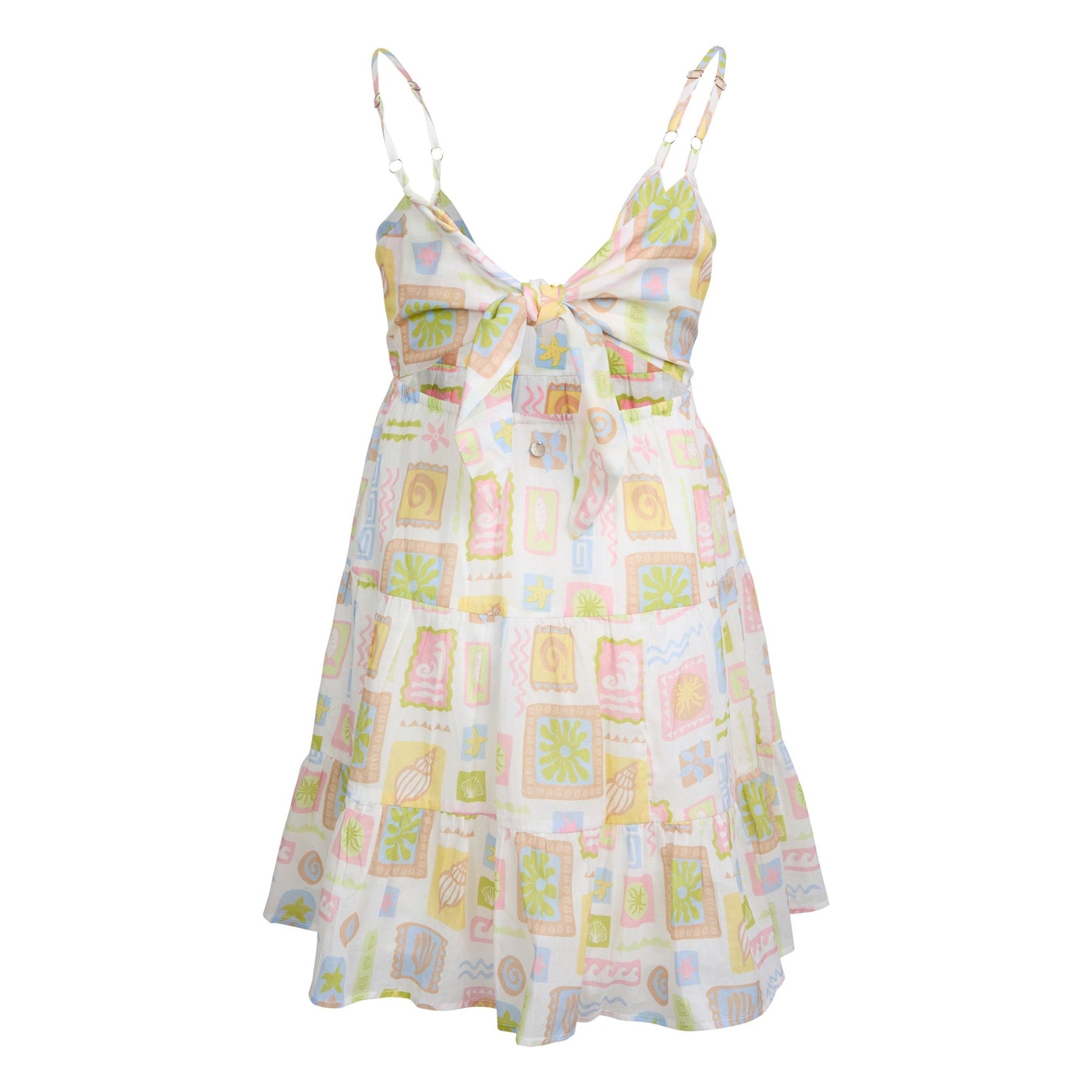 Stay cool and stylish this summer with the Matisse Tiered Mini Dress by Eve Girl. This dress features a custom all over yardage print on a breezy cotton fabrication, this style is fully lined and complete with adjustable straps, tiered skirt and a self fabric tie at the centre back.
