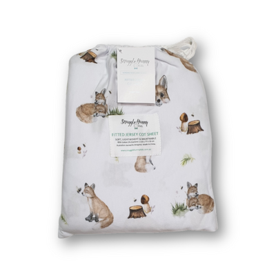 Our Snuggle Hunny Fox Fitted Cot Sheet is made from snuggly soft stretch cotton jersey. It features our exclusive Snuggle Hunny Fox print and comes in a matching drawstring bag.